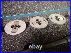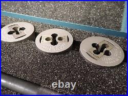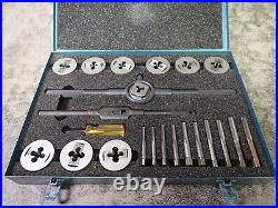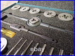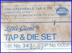 This listing is for a NEW Greenfield Little Giant Tap & Die Set. Specifications for this part are as follows: Part Number: 423162. Set Tap Sizes: 1/4-20 NC, 1/4-28 NF, 5/16-18 NC, 5/16-24 NF, 3/8-16 NC, 3/8-24 NF, 7/16-14 NC, 7/16-20 NF, 1/2-13 NC, 1/2-20 NF Set Die Sizes: 1/4-20 NC, 1/4-28 NF, 5/16-18 NC, 5/16-24 NF, 3/8-16 NC, 3/8-24 NF, 7/16-14 NC, 7/16-20 NF, 1/2-13 NC, 1/2-20 NF Set Tap Wrench Size #5 (300) Set Die Collet Size #1 (1381). Other: New Parts in Original Steel Case with Ethafoam Liner. Thanks for your interest in this item, please checkout my other items.